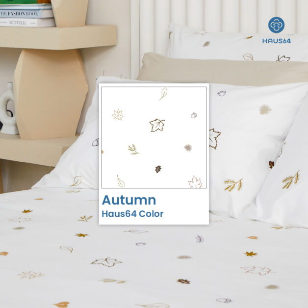 พูดถึงโทนอบอุ่น จะขาดลวดลาย Autumn ที่ได้แรงบันดาลใจจากฤดูใบไม้ร่วงของยุโรปไปได้อย่างไร ผ้าปูที่นอนขาวเติมลวดลายเล็กๆ อย่างใบไม้แห้ง ใบสน ลูกโอ๊ค ให้ความรู้สึกอบอุ่นน่าซุกตัวบนเตียงจนไม่อยากลุกไปไหน ให้บรรยากาศสบายถึงขีดสุด