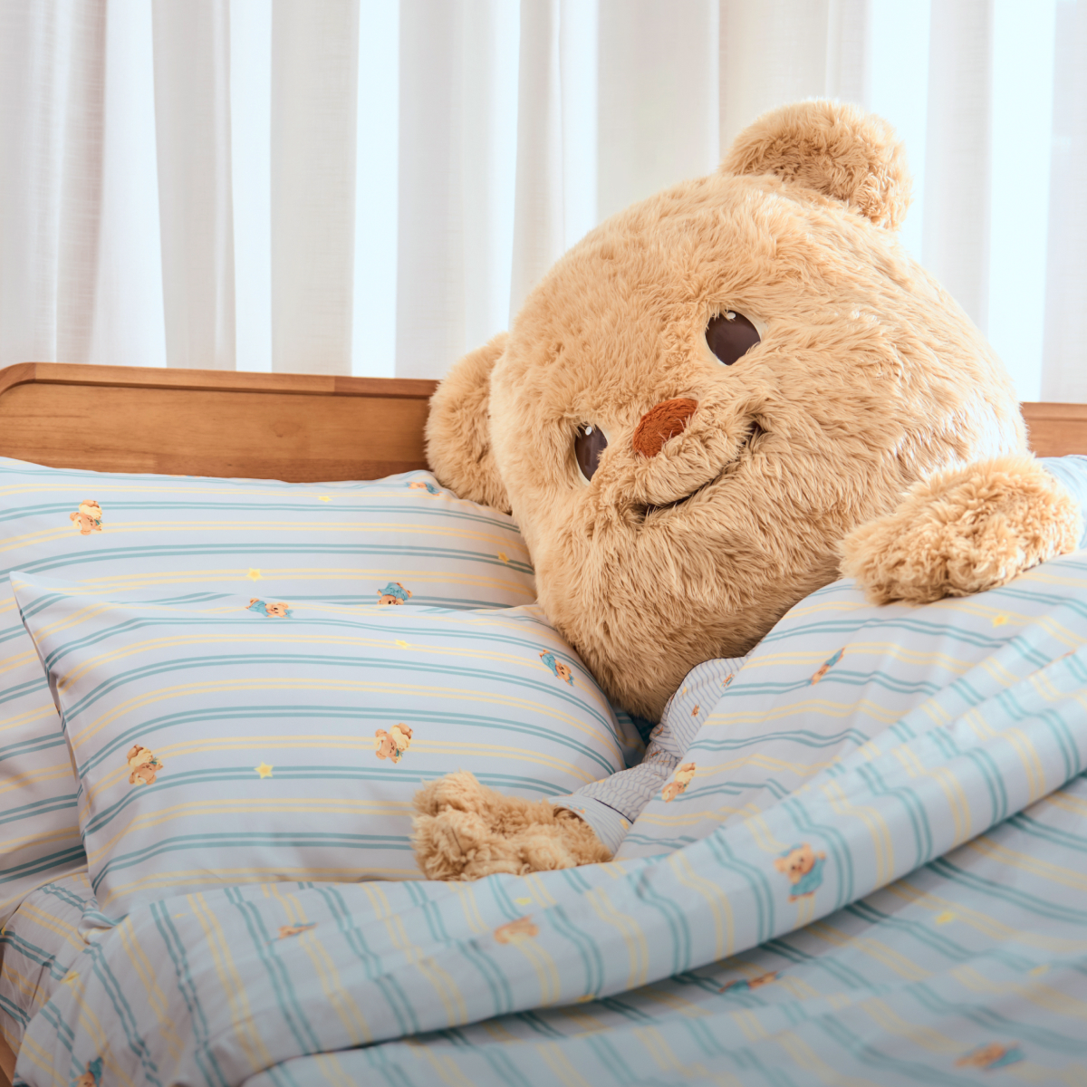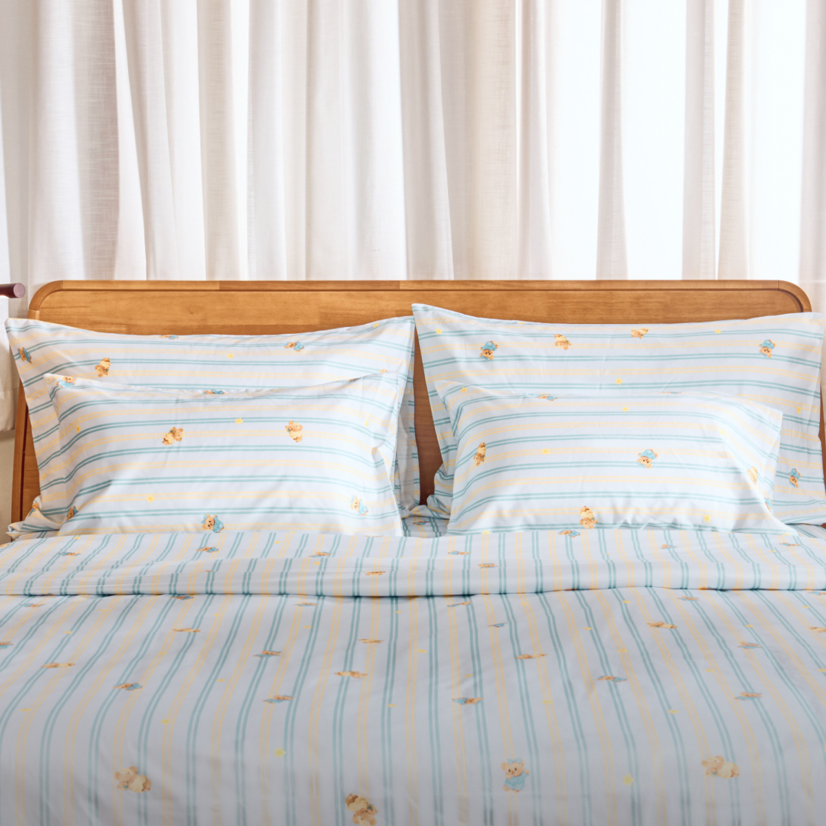 ผ้าปูโทนสีฟ้าสดใส มีลูกเล่นเป็นลายทางสีเหลืองและสีน้ำเงินเข้ม ตกแต่งด้วยลายน้องเนยสุดน่ารักในชุดคลุมอาบน้ำสีฟ้าและสีเหลือง